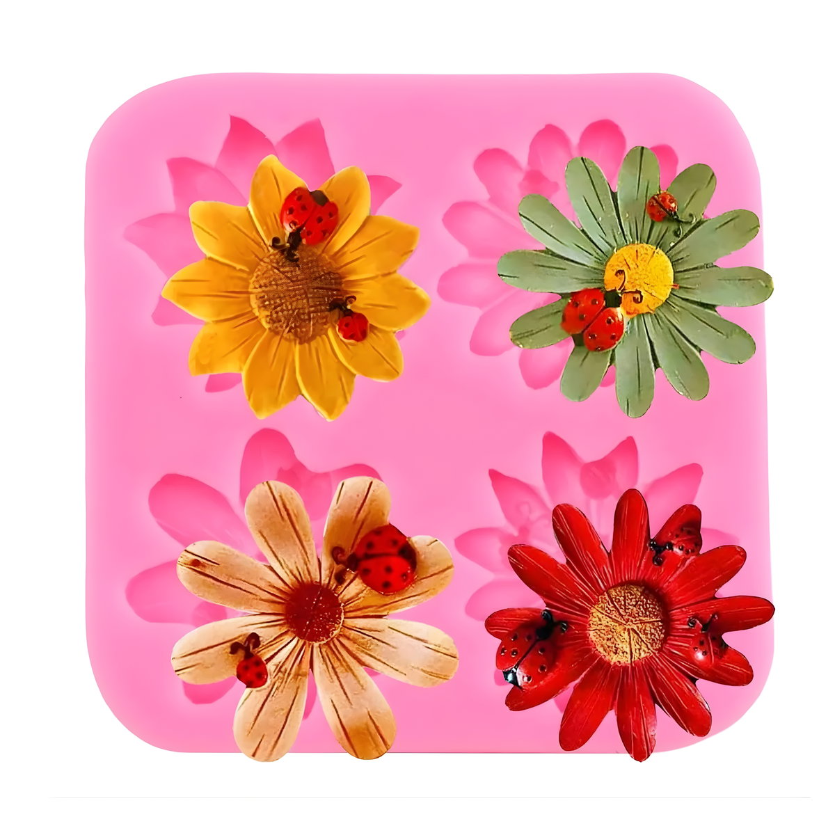 Molde flexible de silicona con 4 cavidades de flores, ideal para crear piezas con excelente detalle. Perfecto para resina, jabón, cera y manualidades.