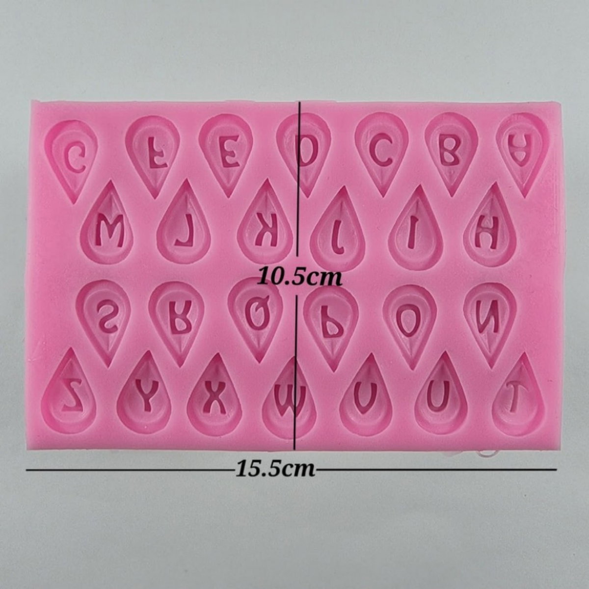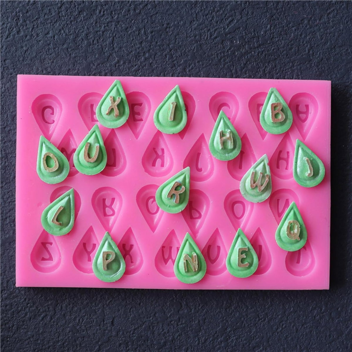 Molde de silicona con cavidades en forma de gota que incluyen letras del alfabeto. Ideal para personalizar piezas con iniciales o nombres en resina, jabón, porcelana fría o repostería.