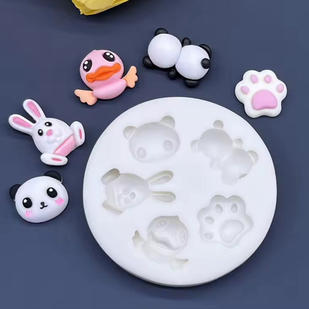 Molde de silicona con diseños tiernos de animalitos estilo kawaii: oso/panda, conejito, patito y huellita. Ideal para crear piezas pequeñas y delicadas en resina, jabón, porcelana fría o repostería creativa.