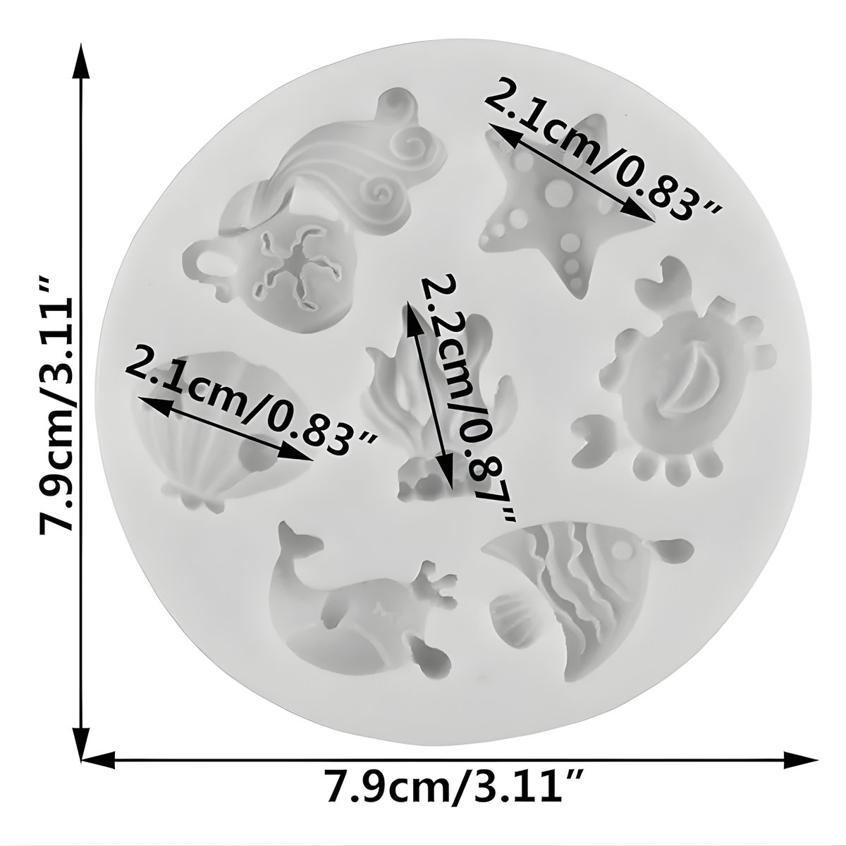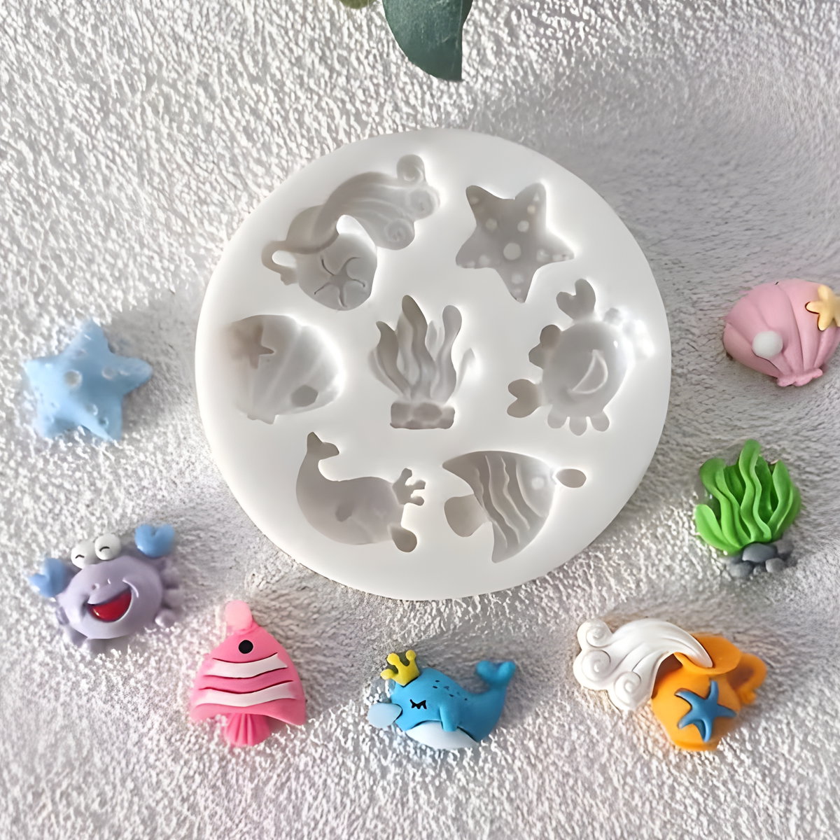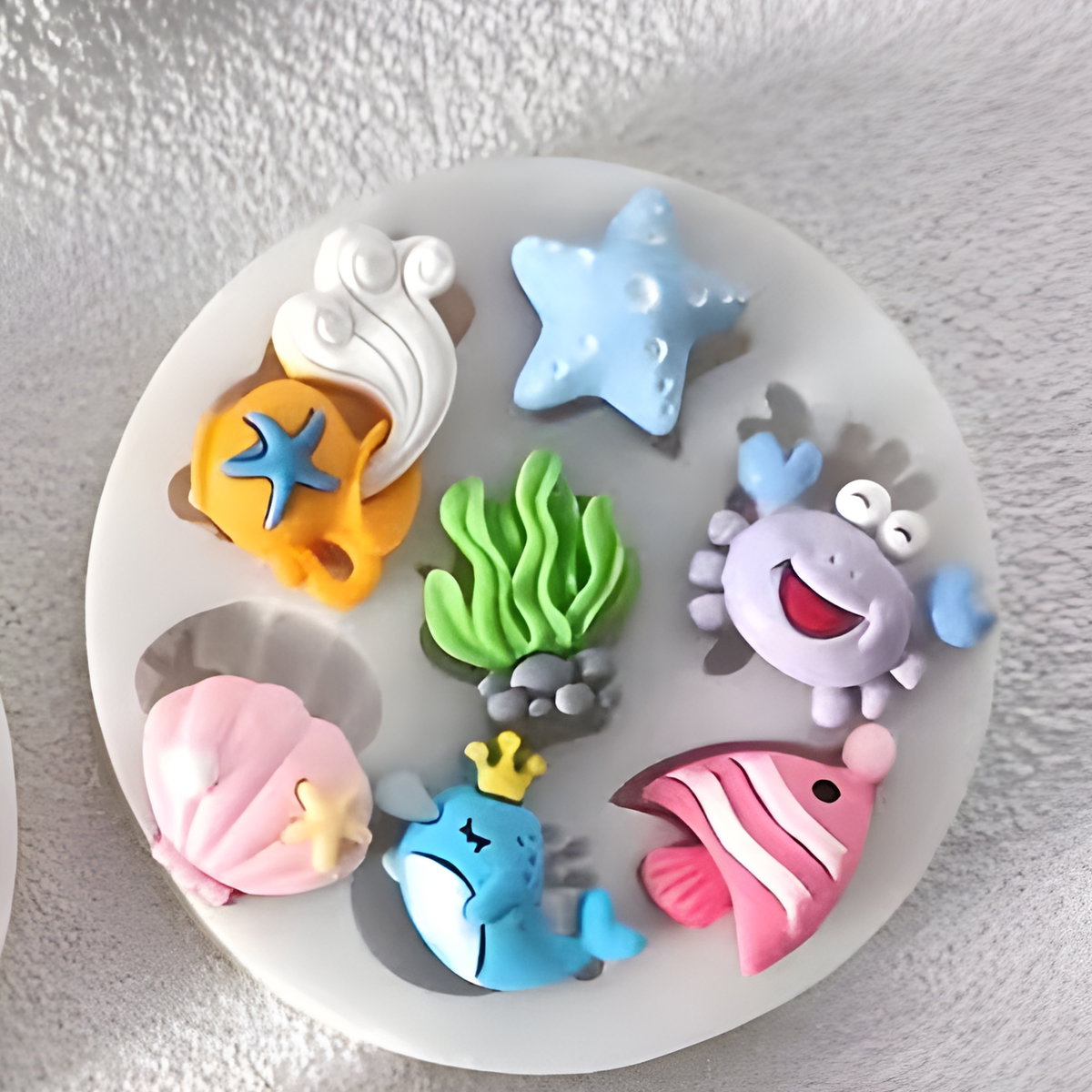 Molde redondo con diseños de mar: pez, estrella, conchas, cangrejo y algas.