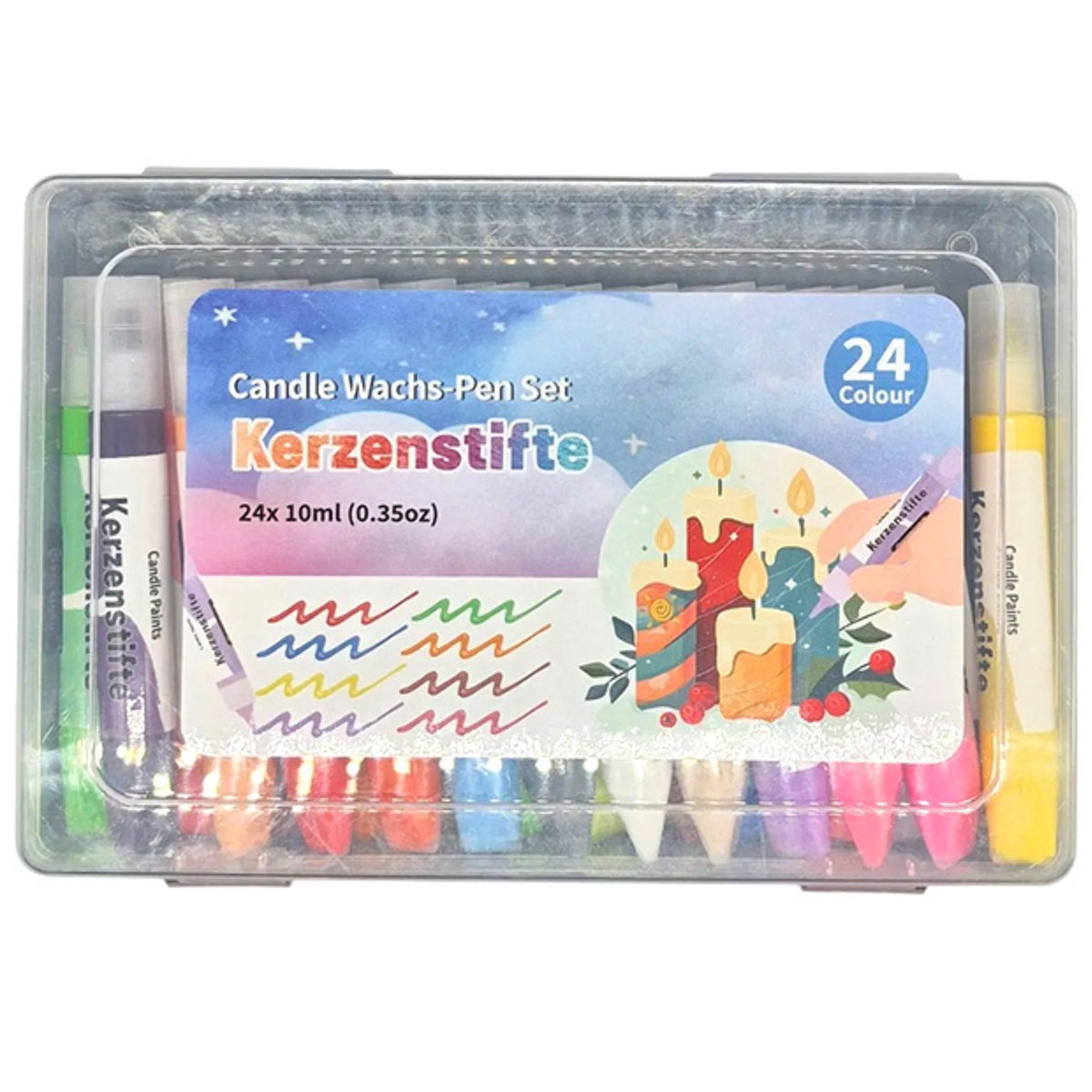 Set de marcadores de cera para velas con 24 colores, diseñados para decorar y personalizar velas de forma precisa y sencilla. Su formato tipo marcador permite escribir y dibujar con control, logrando acabados prolijos y colores intensos.