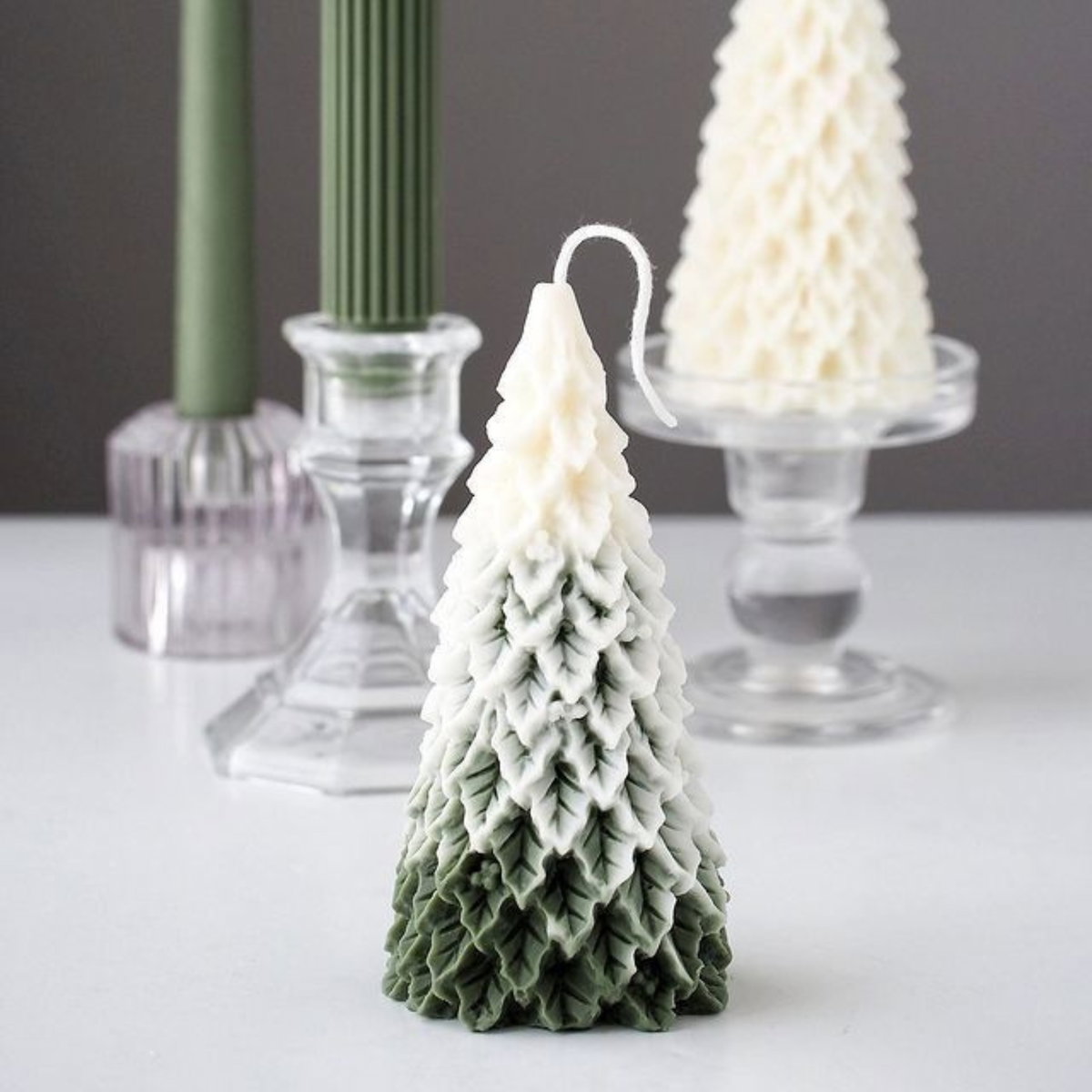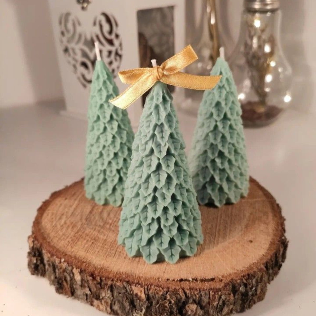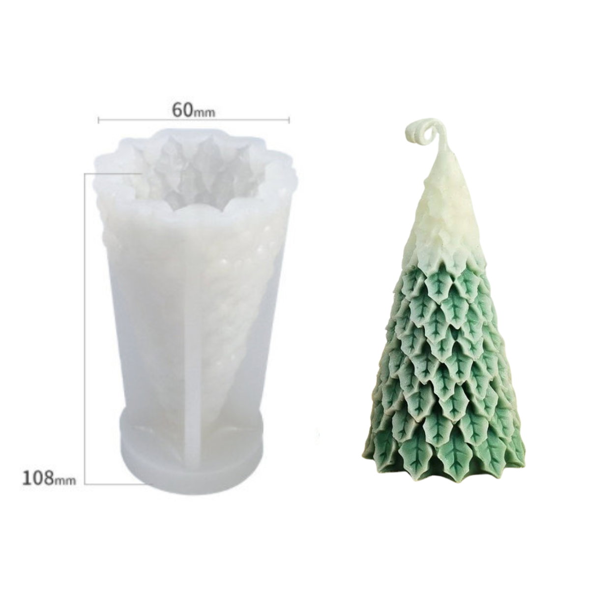 Molde de silicona flexible de alta calidad, ideal para la creación de velas decorativas con diseño de árbol navideño texturizado, que imita capas de hojas y brinda un acabado detallado y elegante.