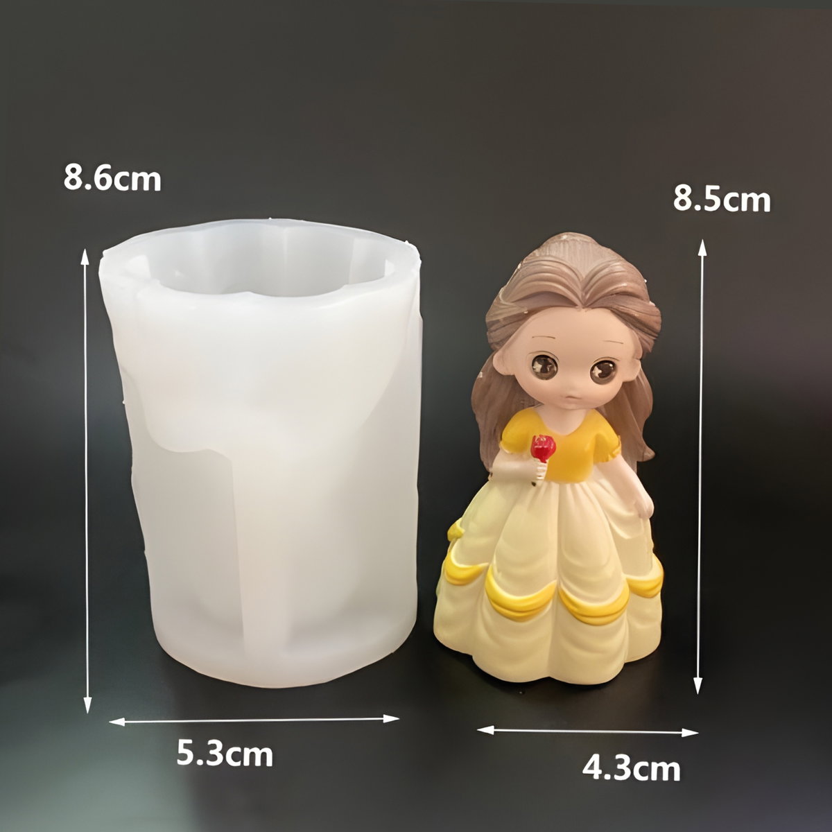 Molde de silicona flexible con diseño de personaje femenino tipo princesa, de estilo delicado y bien definido, ideal para la elaboración de velas, figuras decorativas o piezas artesanales. El molde tiene un tamaño aproximado de 8,6 cm de alto por 5,3 cm de ancho, y la figura final mide alrededor de 8,5 cm de alto por 4,3 cm de ancho. Fabricado en silicona resistente, permite un desmolde fácil y conserva con precisión los detalles del diseño.