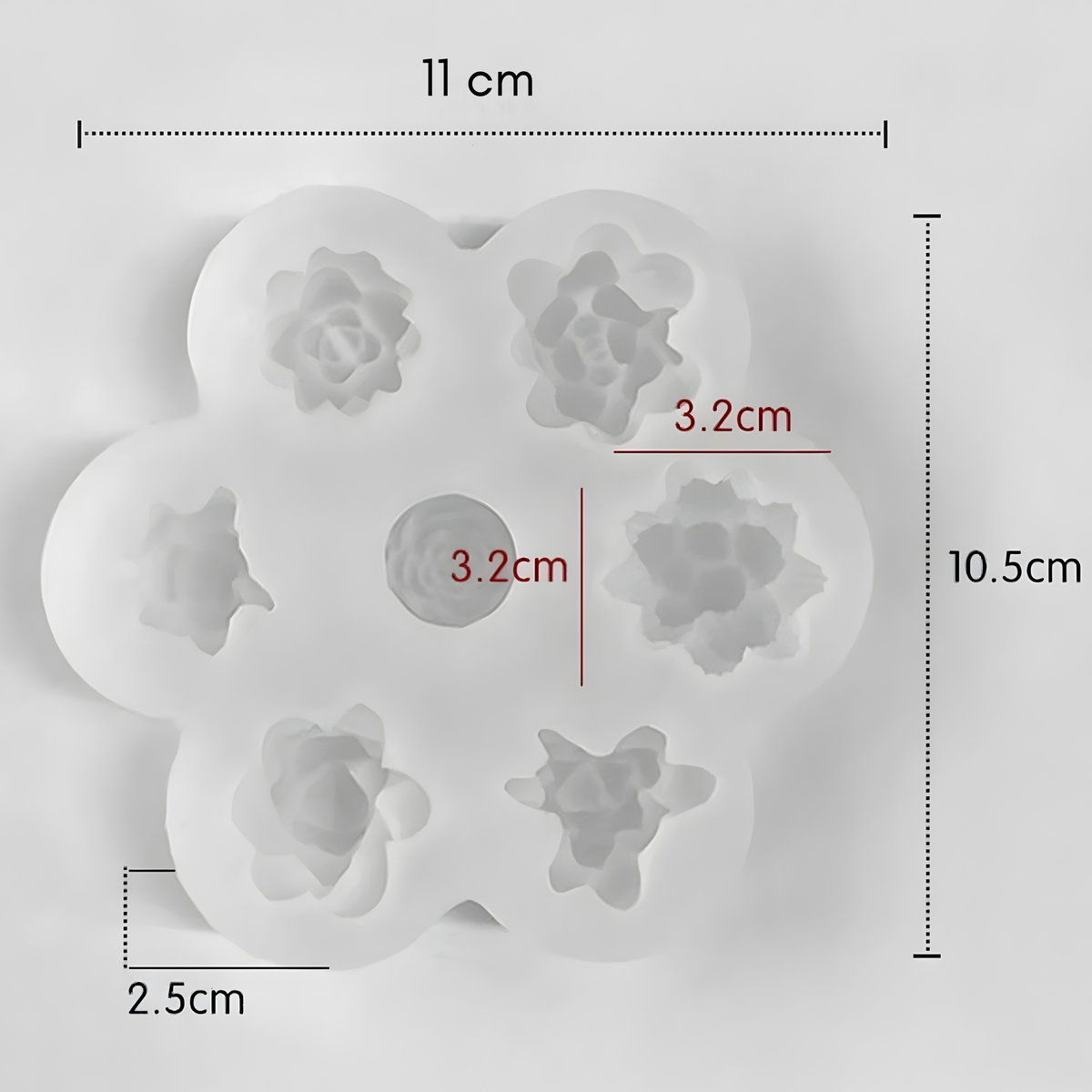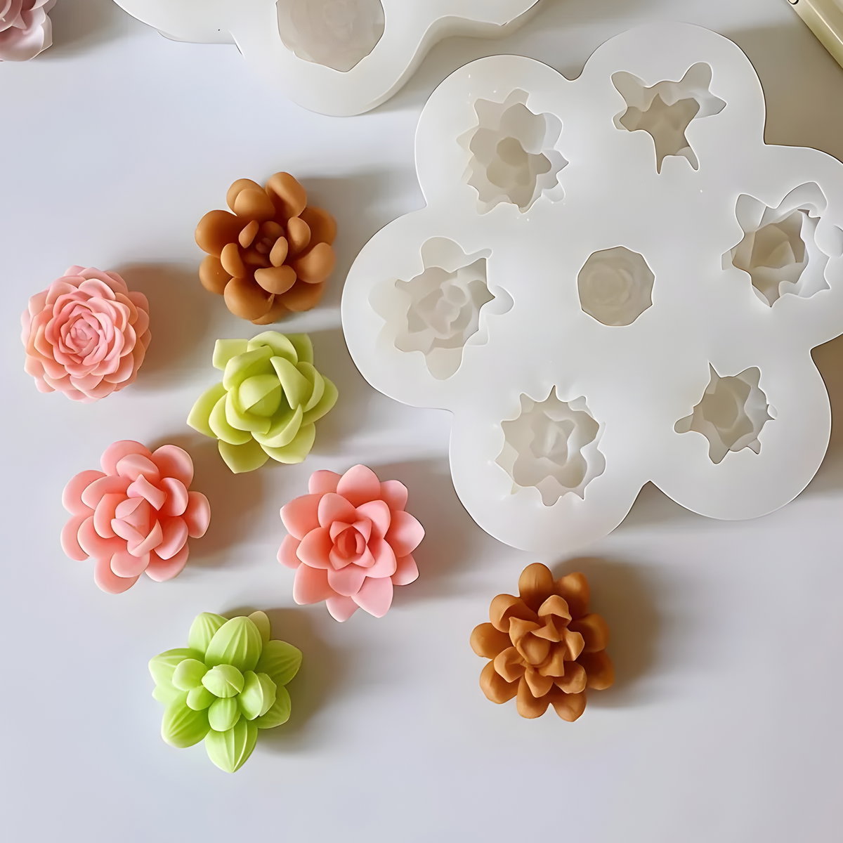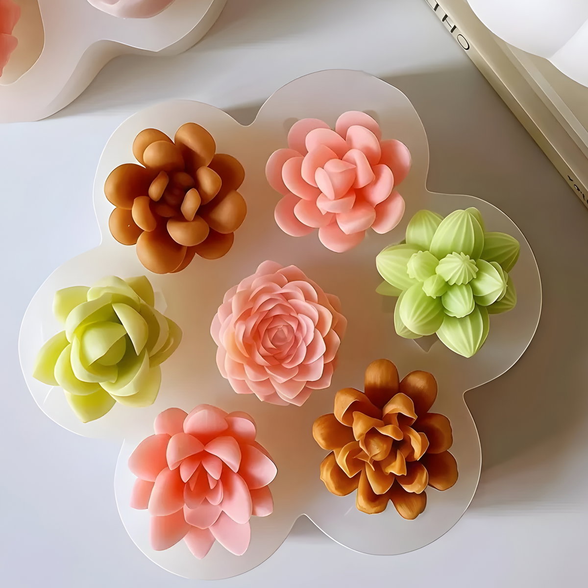 Molde de silicona con múltiples cavidades de diseños variados tipo suculentas y flores, ideal para la elaboración de mini velas decorativas con alto nivel de detalle. Permite crear varias piezas en una sola preparación, optimizando tiempo y producción.