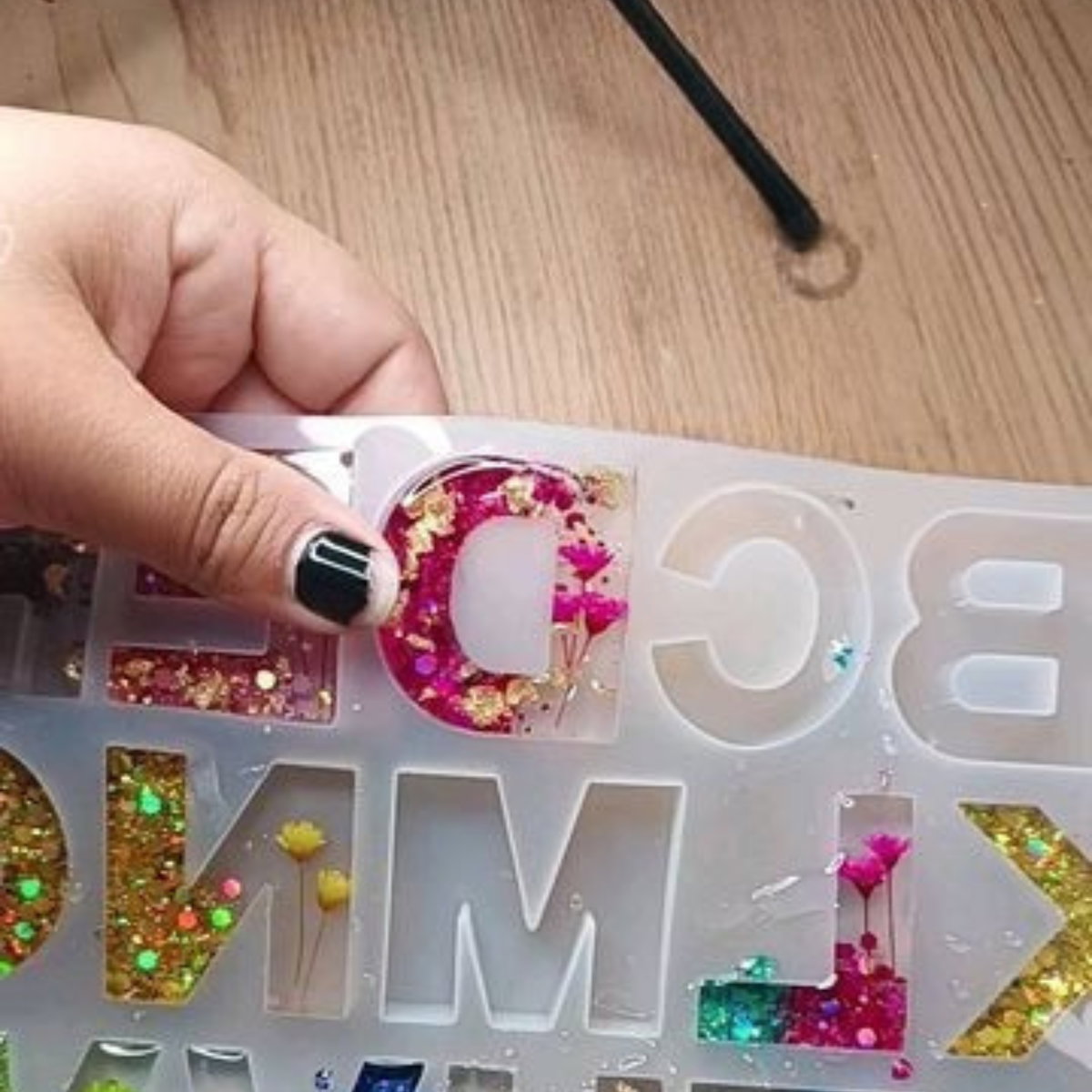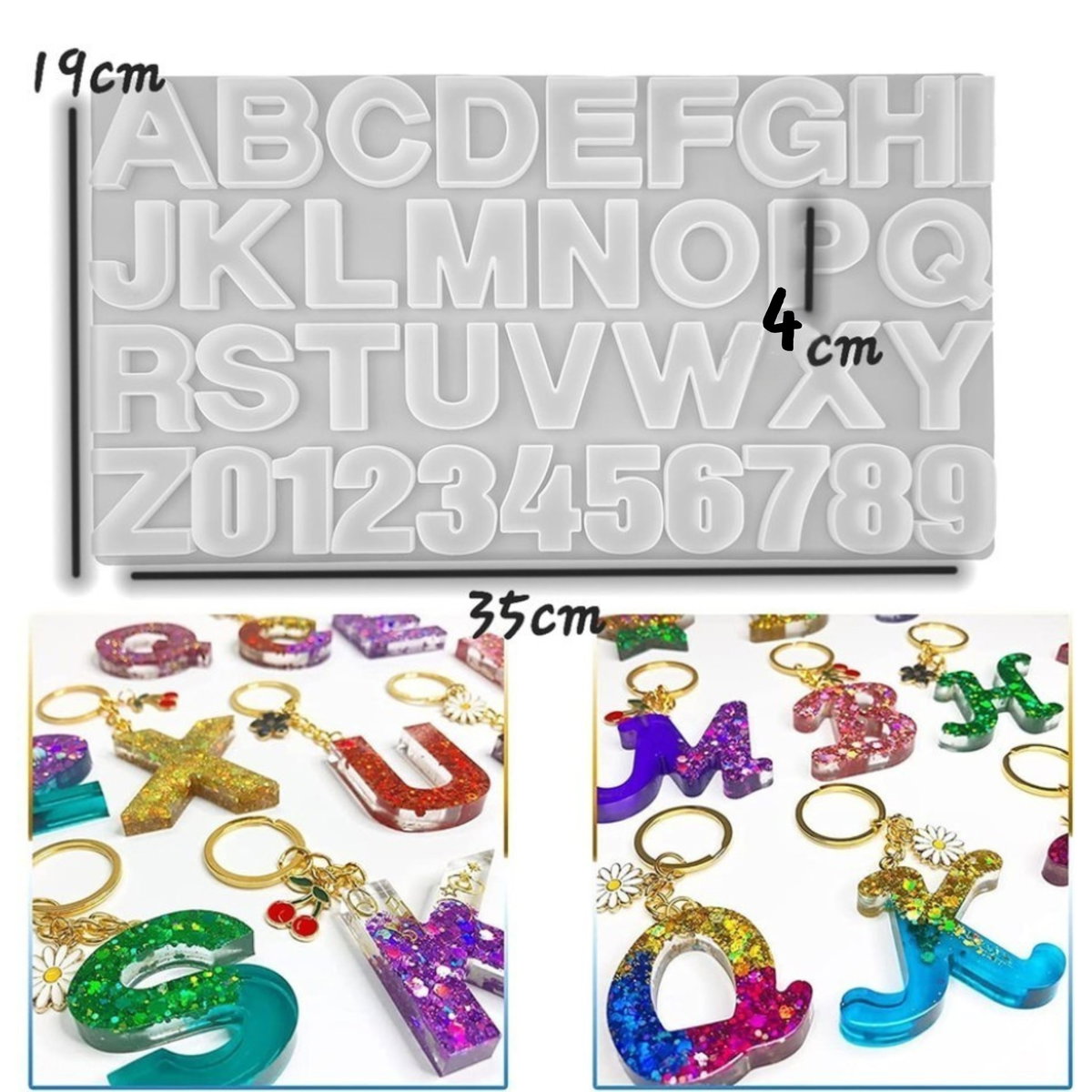 Molde ideal para trabajos en resina, diseñado con letras mayúsculas de la A a la Z y números del 0 al 9. Perfecto para crear llaveros personalizados, nombres, iniciales y piezas decorativas