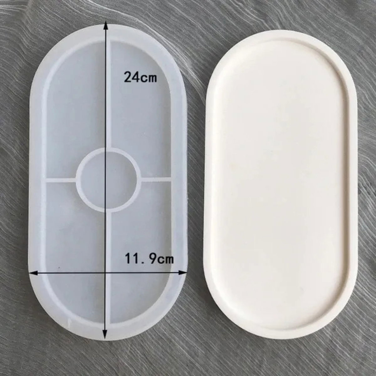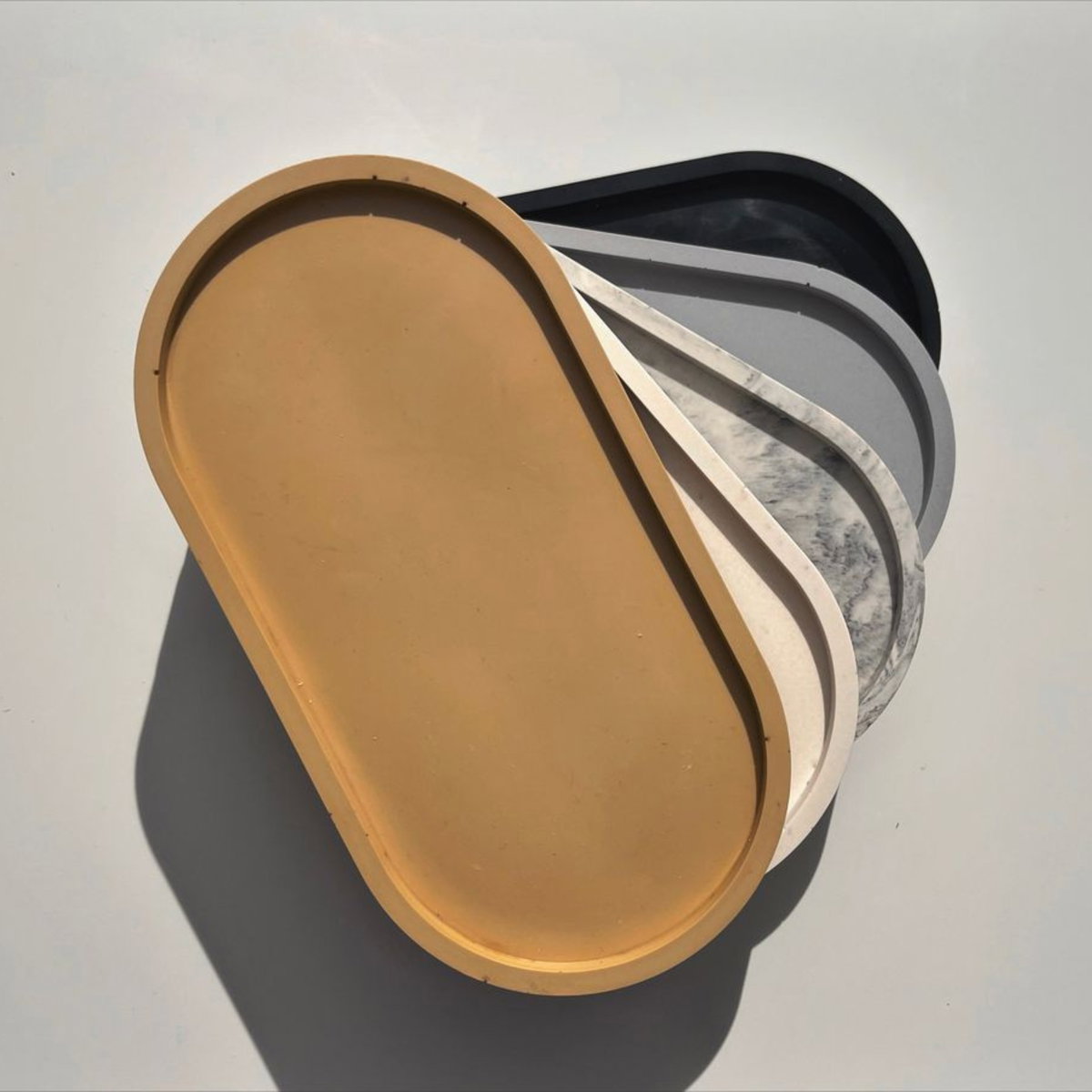 Molde con diseño ovalado de bordes suaves, ideal para crear bandejas decorativas en yeso o cemento. Su estilo simple y moderno lo hace perfecto para decoración funcional en cualquier espacio