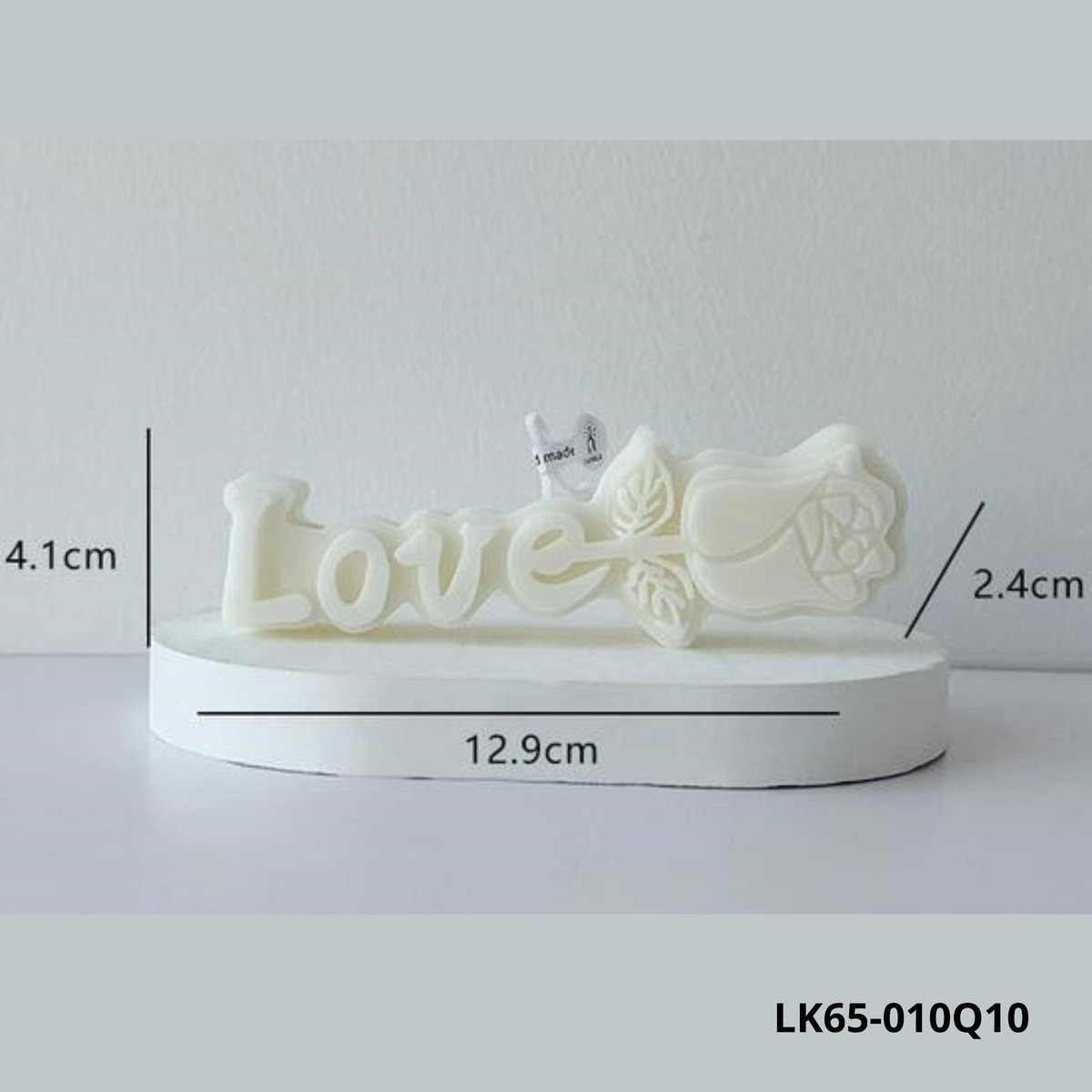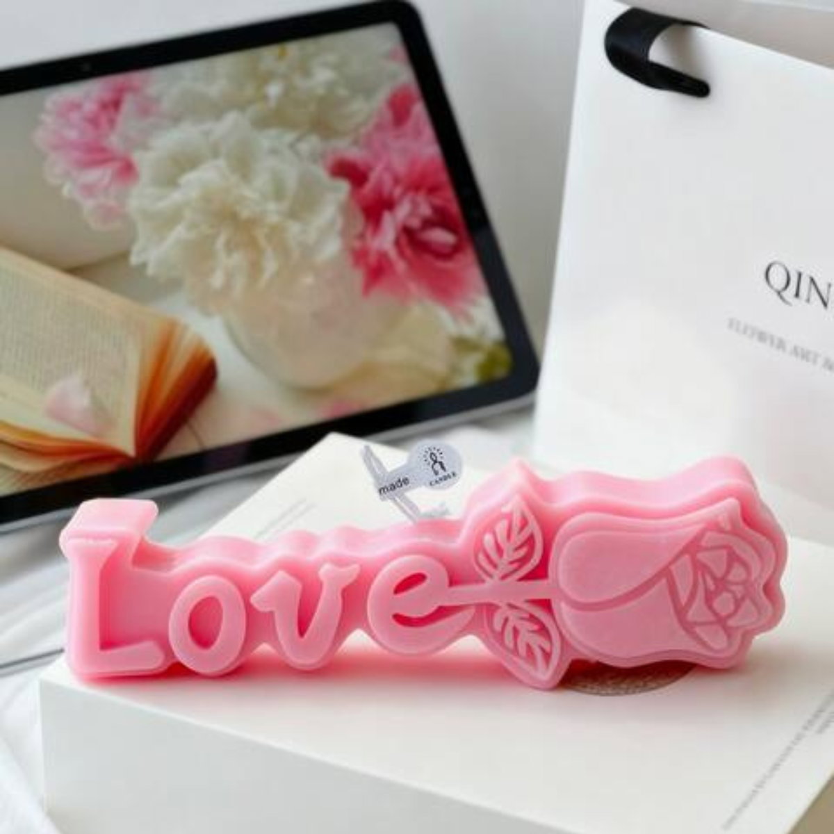 Molde de silicona con diseño decorativo de la palabra “Love” acompañada de una rosa en relieve, ideal para la elaboración de velas artesanales con estilo romántico y delicado.