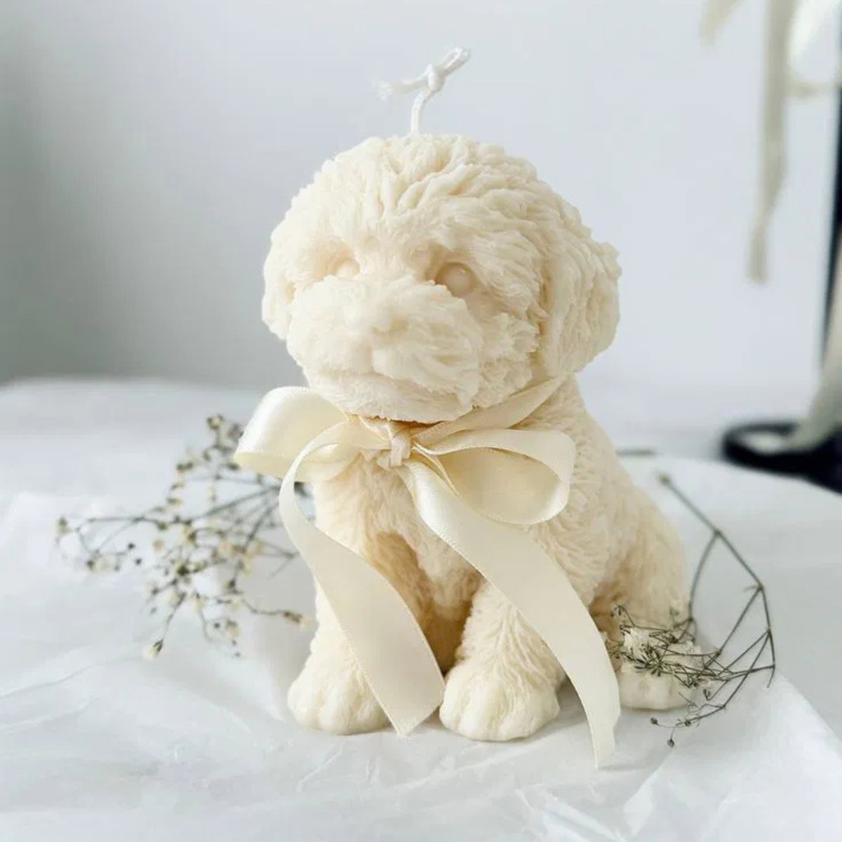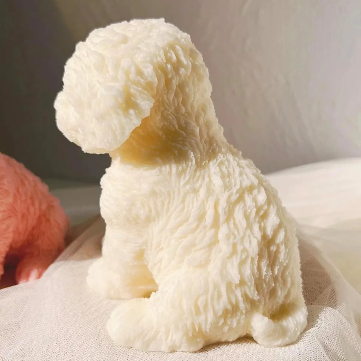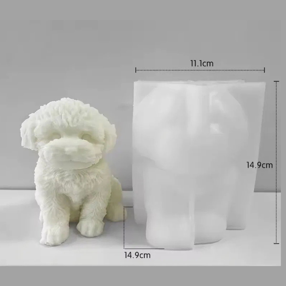 Molde de silicona con diseño de perrito en posición sentada, ideal para la elaboración de velas decorativas con alto nivel de detalle y acabado realista. Su diseño incluye textura tipo pelaje, aportando un resultado visual atractivo y delicado.