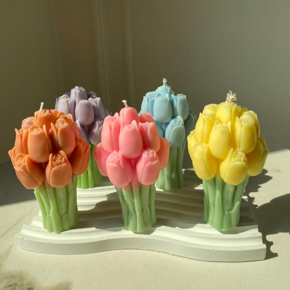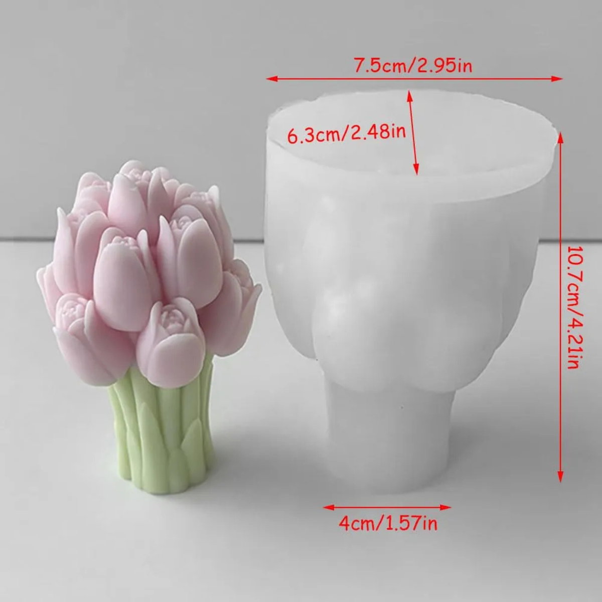 Molde de silicona con diseño de ramo de tulipanes en formato tridimensional, ideal para realizar velas decorativas, piezas en resina, yeso o porcelana fría. Permite obtener una figura con excelente nivel de detalle en pétalos y tallos.