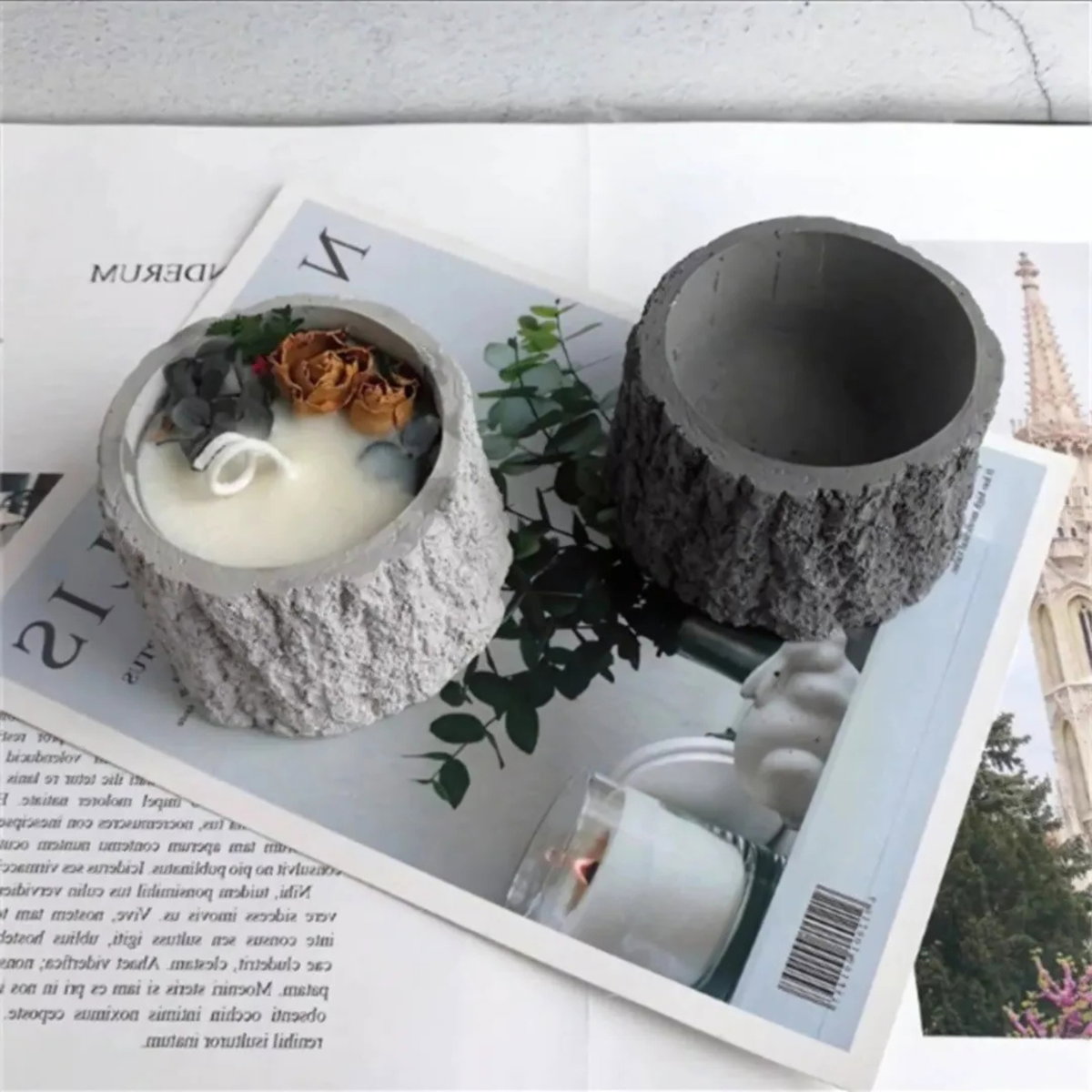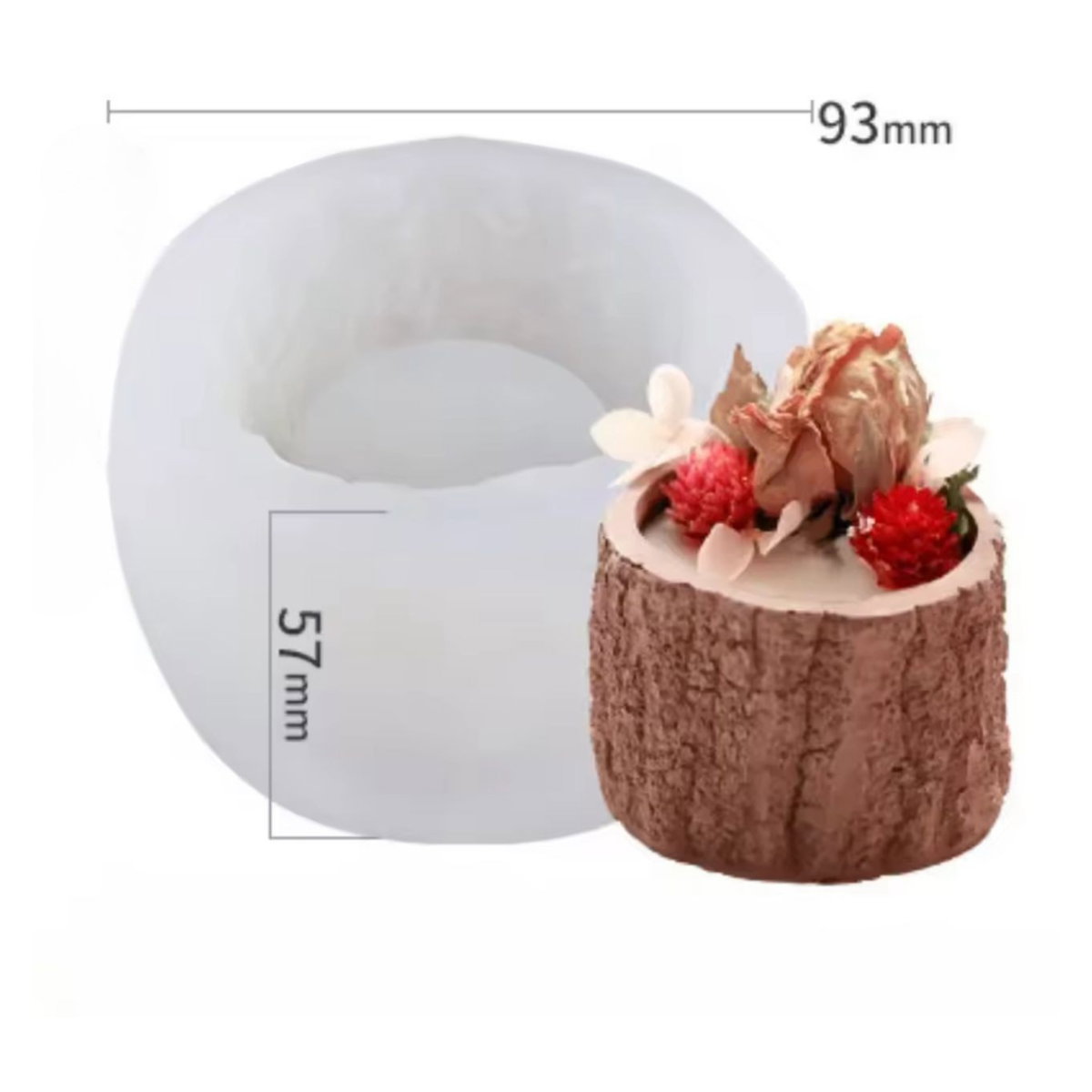 Molde de silicona con diseño de tronco rústico, ideal para realizar velas decorativas, macetas pequeñas, recipientes o piezas en resina, yeso y cemento. Su textura imita la corteza de madera, logrando un acabado natural y detallado.
